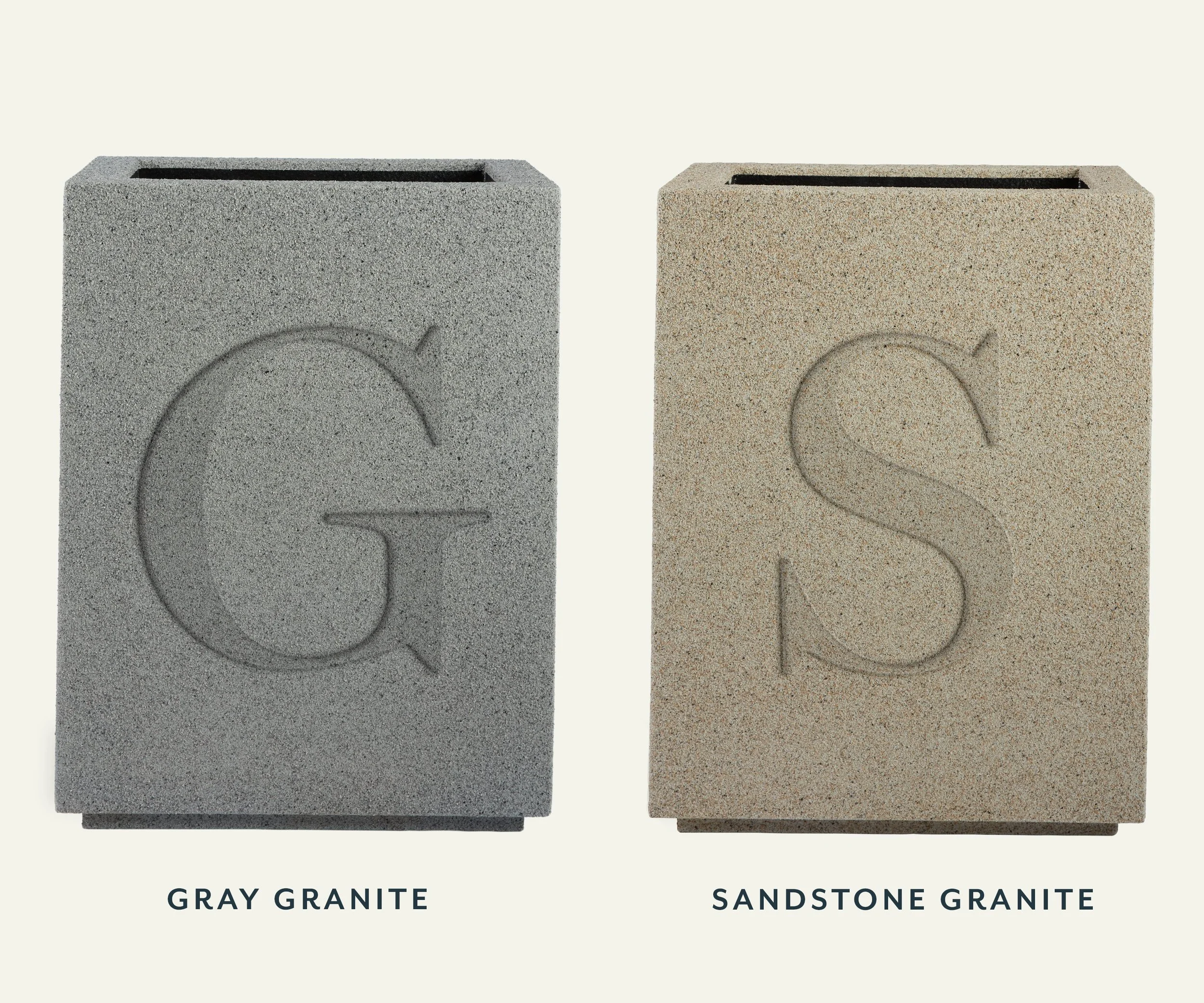 Our Monogram planter comes in the same versatile size as the Cozumel and is available in gray granite and sandstone granite.